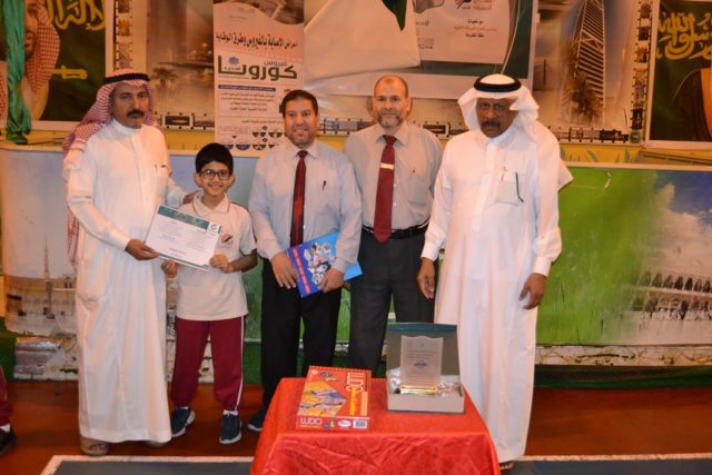 في حضور قائد القسم الابتدائي ومشرف اللغة الانجليزية وأسرة اللغة الانجليزية تكريم الطلاب الحاصلين على المراكز الأولى في اليوم الكامل للغة الانجليزية والذي أقيم بمدارس جيل الإبداع بمكة المكرمة