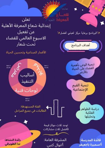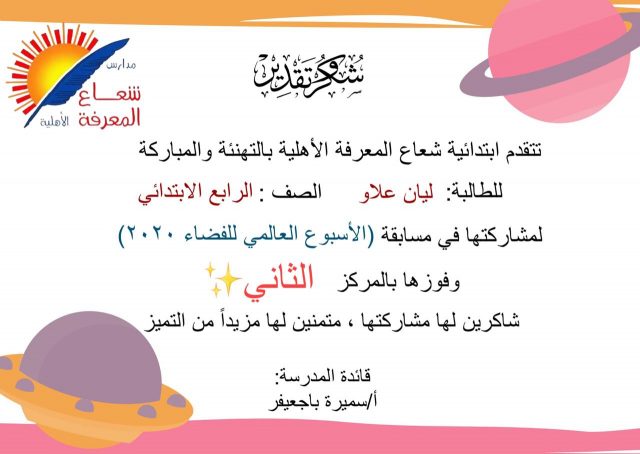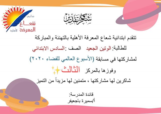 نتيجة مسابقة الأسبوع العالمي للفضاء المقامة بابتدائية شعاع المعرفة الأهلية وبرعاية قائدة القسم أ. سميره باجعيفر